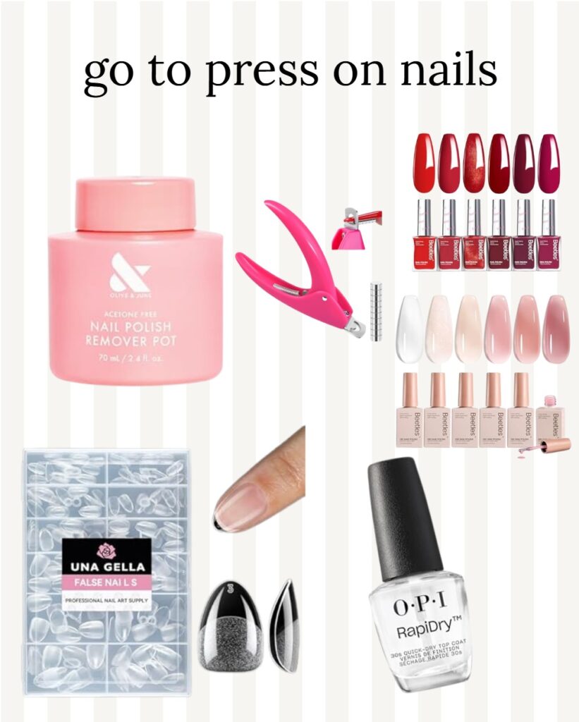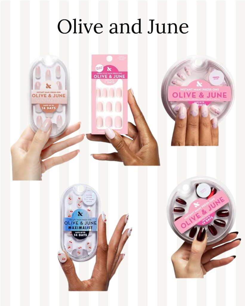 Okay friend, Olive & June press-on nails are one of those brands that just feel super clean, simple, and really natural looking, which I love. They’re known for giving you that “your nails but better” vibe, like soft neutrals, pretty everyday shades, and classic styles that don’t look over-the-top. Most of their sets (like these 👉 Olive & June Instant Mani Press-On Nails) come with a ton of size options so you can actually get a really good fit, and they include everything you need to do your nails at home. They’re also made with non-toxic glue and are designed to last up to about two weeks if you apply them right, which is honestly so nice for press-ons