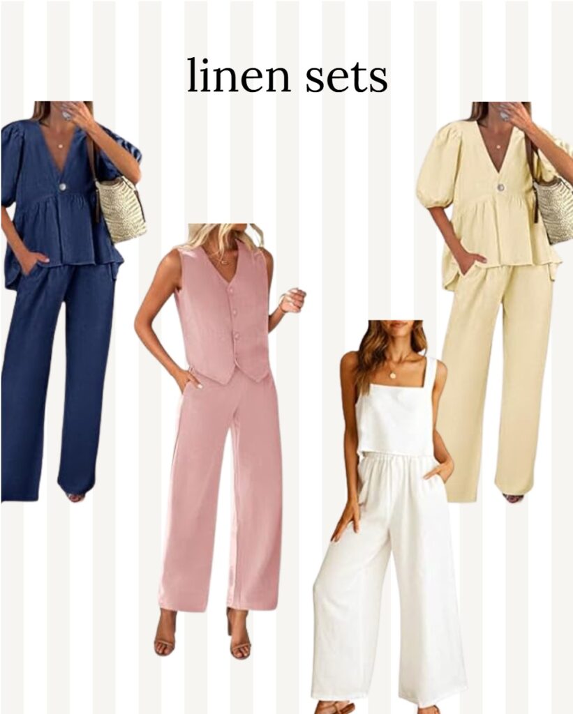 Think a linen top with matching shorts or pants. Neutral tones work best, but soft stripes can be really pretty too.
