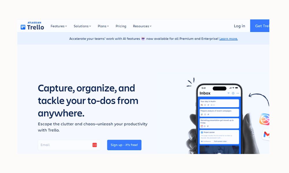 Trello is a visual project management app that uses boards, lists, and cards to organize tasks. It’s especially helpful for entrepreneurs who like seeing their work laid out clearly from “to do” to “done.” You can create boards for launches, blog posts, clients, or content calendars. Its drag-and-drop simplicity makes it easy to use without a learning curve.