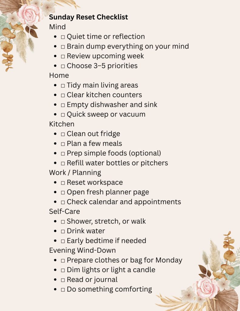 Some Sundays will feel productive and calm, and others will feel messy or tired. Both are okay. This routine is meant to support you, not pressure you. You’re allowed to move slowly, to do less, and to meet yourself exactly where you are.